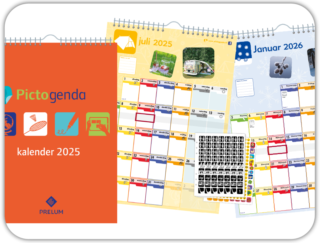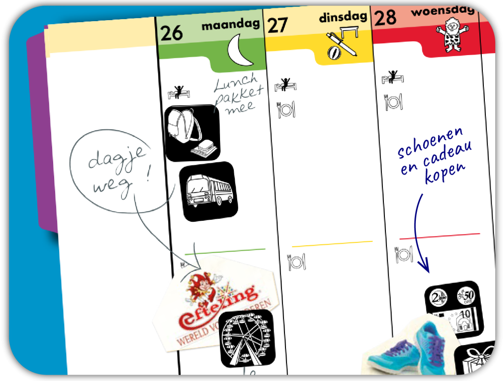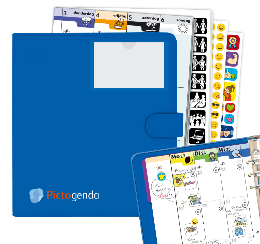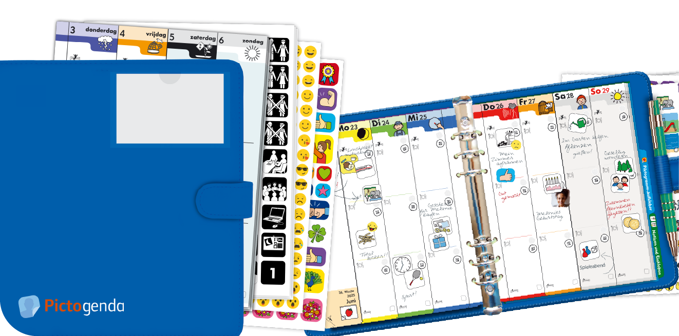 - De weekagenda: een agenda van januari t/m december met een visuele ondersteuning van de tijd en weekdagen en voorgedrukte feestdag-pictogrammen. Deze pictogenda geeft overzicht per week. Persoonlijke activiteiten en afspraken kunnen met behulp van de ingebonden pictogram-sticker set per dagdeel, dag en week worden ingeplakt